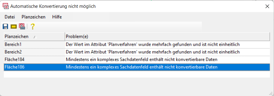 Anmerkung: Der Abbruch der Konvertierung bedeutet nicht, dass weitere gewählte, aber unproblematische Planzeichen nicht im Rahmen der Möglichkeiten konvertiert würden. Die automatische Konvertierung arbeitet somit die Dinge ab, die funktionieren. Es muss nur für die aufgeführten, kritischen Fälle eine manuelle Begutachten erfolgen. |