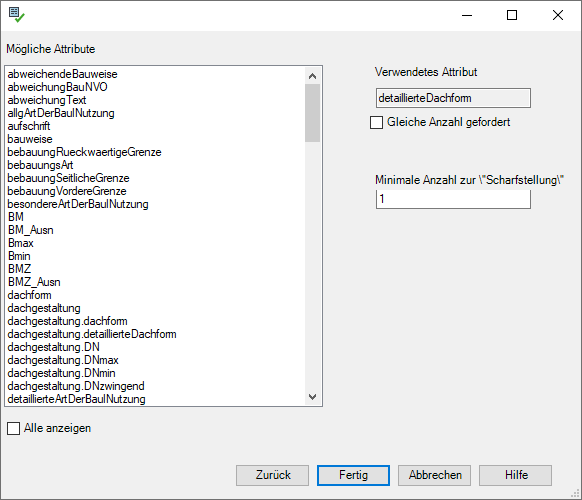 Die linke Seite der Dialogbox listet alle Attribute auf, die zum derzeit ausgewählten Exporttyp passen. Abzüglich der im Schritt zuvor gewählten Attribute. Durch einen Doppelklick wird dann ein Attribut gewählt, dass die zuvor ausgewählten weiter einschränkt. Über die Checkbox Gleiche Anzahl gefordert kann eingestellt werden, ob das einschränkende Attribut genau oder mindestens genauso oft belegt sein muss, wie das einzuschränkende Attribut. Das Feld Minimale Anzahl zur \"Scharfstellung\" gibt an, wie oft das einschränkende Attribut mindestens belegt sein muss, um die Prüfung zu aktivieren. |