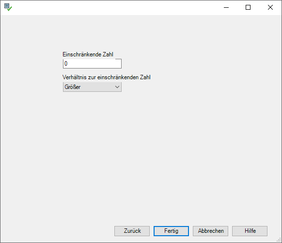Das obere Feld zeigt den Wert, auf den eingeschränkt werden soll, während das untere Feld die Art der Einschränkung darstellt. Im hier gezeigten Beispiel (Die Relation „Verweis auf Textabschnitte" muss mindestens einmal belegt sein), wird an dieser Stelle dadurch umgesetzt, dass >0 gleichzusetzen ist, mit „mindestens einmal belegt". Über den Fertig-Button wird der Dialog geschlossen und die Zuweisung wieder geöffnet. |