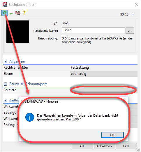 Solange man nun innerhalb des Netzwerks oder der WS LANDCAD-Version mit den Planzeichen arbeitet, entstehen letztlich keine Probleme. Wechselt man allerdings die Version oder wird die DWG außerhalb des Hauses bearbeitet, kann das Programm die Bibliothek u. U. nicht auffinden, weil der Name 'Planzv90_1' nicht definiert ist. Wenn man nun Planzeichen mit dem Befehl Sachdaten editieren wählt, sind die Sachdatenzeilen ausgegraut und das Dia-Feld ist schwarz. Über das Werkzeug "Sachdatenfelder und Eigenschaften mit aktueller Bibliothek abgleichen" erscheint die Meldung: