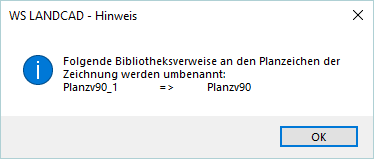 Den Namen kann man ändern. Wenn die Planzeichen zukünftig mit der Planzv90.sqlite weiterbearbeitet werden sollen, wäre z. B. Planzv90_1 in Planzv90 zu ändern. Der Name des geänderten Bibliotheksnamens wird anschließend kursiv dargestellt und mit OK erfolgt die Umbenennung an den fehlerhaften Planzeichen der Zeichnung: