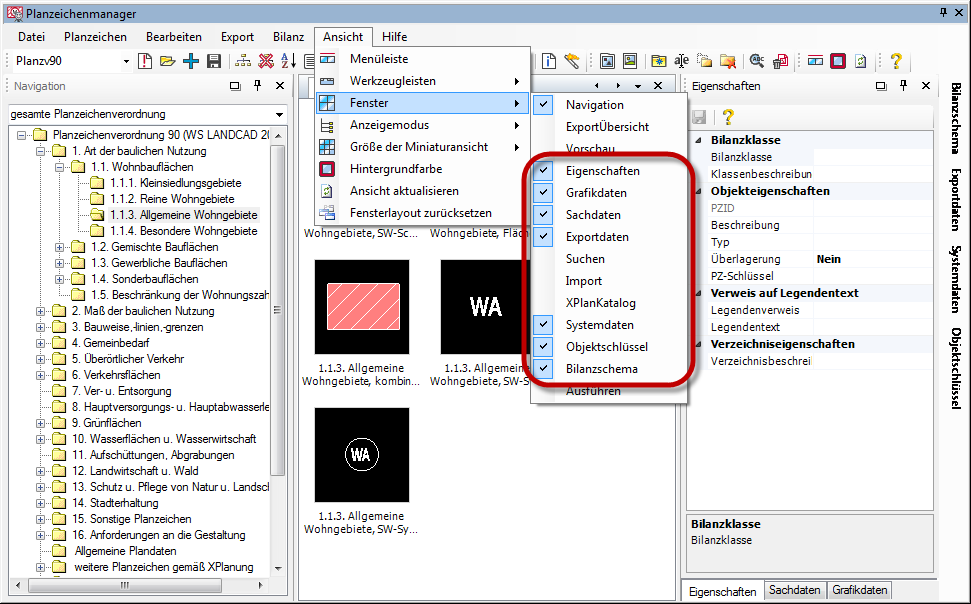 Der Planzeichenmanager stellt für alle benötigten Einstellungen entsprechende Fenster bereit, die über das Pull-down-Menü Ansicht aktiviert werden können.