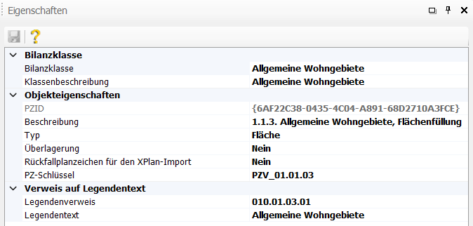 Dieses Fenster dient zur Grundkonfiguration eines Planzeichens. Über die verfügbaren Einstellungen legen sie den Namen des Planzeichens und den grundsätzlichen Objekttyp, die Bilanzklasse und den Legendenverweis fest. Die einzelnen Einstellungen werden in den nachfolgenden Kapiteln erläutert.