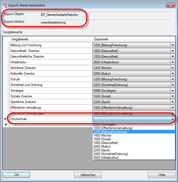 In Einzelfällen kann diese Liste nicht gefüllt sein oder man hat in einem Bestandsplan eine alternative Schreibweise für den Inhalt eines Sachdatenfeldes in WS LANDCAD verwendet und möchte diese beim Export berücksichtigen können. In diesem Fall markiert man die letzte Zeile des Dialoges (*) und tippt seine gewünschte Schreibweise ein (z. B. Hochschule). Diesen konkreten Inhalt berücksichtigt XPlanung nicht und man muss einen naheliegenden Exportwert zuweisen (z. B. Bildung und Forschung). Eigene Exportwerte können hier nicht hinterlegt werden, weil das den Bestrebungen zur Standardisierung entgegen stehen würden.