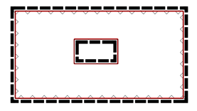 Besitzt die gewählte Begrenzung eine Insel, die bei den innen liegenden Planzeichen nicht beachtet wurde, meldet WS LANDCAD dies als Fehler in der Begrenzungsprüfung. In dem Beispiel ragt die Fläche der Randsignatur mit den Dreiecken als Ganzes in die Geltungsbereichsinsel. Das ist ein Fehler, denn die Randsignatur muss auch an der inneren Insel ausgespart werden. |