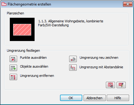 Zum Anwenden eines flächenhaften Planzeichens rufen Sie den Befehl über das Menü, das Icon, per Drag & Drop oder durch Doppelklick in das Diabild auf. Hierbei erscheint der Dialog Flächengeometrie erstellen, welcher weitere Optionen zur Verfügung stellt.