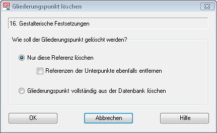 Wie soll der Gliederungspunkt gelöscht werden? Zum Löschen eines Gliederungspunkts stehen drei Optionen zur Auswahl: |