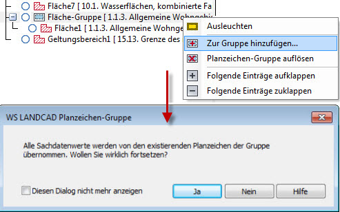 Nach dem Erstellen einer neuen Gruppe auf Basis eines Planzeichens können über das Kontextmenü weitere Planzeichen in diese Gruppe aufgenommen werden. Daraufhin erscheint der Hinweisdialog, dass alle Sachdatenwerte von den existierenden Planzeichen der Gruppe übernommen werden.