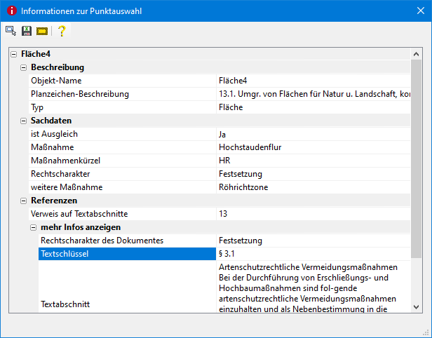 Der Info-Befehl dient der kompakten Anzeige aller Sachinformationen zu einer beliebigen Anzahl an Planzeichen. Die berücksichtigten Sachdatenfelder haben stets einen Inhalt, andernfalls werden sie von dieser Funktion ignoriert. Neben allgemeinen Informationen (Objektname, Planzeichen-Beschreibung, Objekttyp) werden auch Referenzen aufgelistet. Das ist von besonderem Vorteil, wenn die Planzeichen mit Textabschnitten aus den textlichen Festsetzungen verknüpft worden sind (siehe Kapitel Referenztyp: Texte zu grafischen Planzeichen in diesem Handbuch).