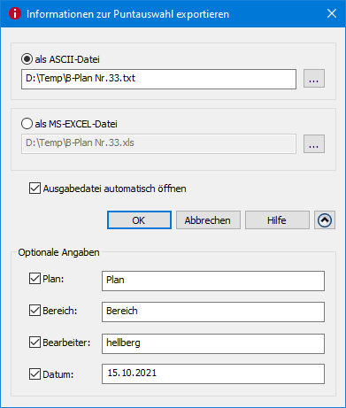 Nach der Wahl der Ausgabeoption "als ASCII-Datei" oder "als MS-EXCEL-Datei" wird der Export über OK ausgeführt. Abbrechen schließt den Dialog. Über eine weitere Optionsschaltfläche werden der benutzerdefinierte Name des aktuellen Planes und des Bereiches eingeblendet. Genauso wie der Bearbeitername und das Datum werden sie bei Bedarf in die ersten Zeilen der exportierten Datei geschrieben.