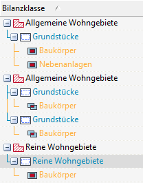 Zur Ermittlung der Nutzungsmaße werden die gewählten Baugebiete mit den darin befindlichen Baukörpern und Grundstücken verschnitten. Die Ergebnisanzeige listet daher die ineinander liegenden Objekte hierarchisch auf. Die einzelnen Planzeichentypen werden mit einem Icon und durch Farben markiert: