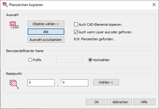 Die Dialogbox Planzeichen kopieren ermöglicht eine selektive Bestimmung der Planzeichen. Es werden die Vergabe von Flächennummern und die Position des Basispunktes beachtet. Auswahl – Mit den Schaltflächen Objekte wählen < und Alle können die zu kopierenden Elemente in der Zeichnung bestimmt werden. Sind im Projektbrowser Planzeichen bereits selektiert, so werden diese als gewählte Planzeichen aufgeführt. Die Auswahl kann über die Schaltfläche Auswahl zurücksetzen aufgehoben werden. |