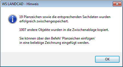 Die angezeigte Anzahl der kopierten Planzeichen und zugehörigen Sachdaten wird in die Windows Zwischenablage kopiert. Nach dem Kopiervorgang erscheint ein Hinweis über die Anzahl der Planzeichen, die inklusive der Sachdaten kopiert wurden, und über die Anzahl der anderen Objekte. |