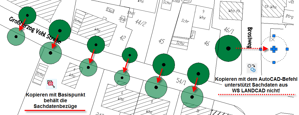 Natürlich unterstützt der Befehl auch das Kopieren innerhalb einer Zeichnung, um z. B. sehr schnell eine Allee zu erhaltender Bäume auf der gegenüberliegenden Seite einer Straße anzuwenden.