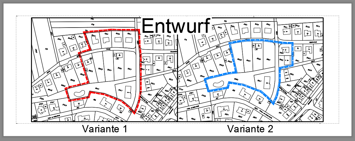 Der Vorteil eines WS LANDCAD Layer-Präfixes ist, dass das Programm den Namen bei jeder Editierung des betreffenden Planzeichens beibehält. Diese Tatsache ermöglicht weiterhin, dass in einem Layout mehrere Ansichtsfenster aufgezogen werden können, die beispielsweise unterschiedliche Varianten des Geltungsbereichs darstellen. Die sonstigen Eigenschaften eines Layers (Farbe, Linienstärke etc.) müssen nicht über die Funktion Grafik editieren eingestellt werden, denn nur wenn ein neuer Layer erstmalig über WS LANDCAD in die Zeichnung gelangt, werden die Eigenschaften aus der zentralen Layersteuerdatei WSLC.ini ausgelesen. Danach sind sie von der WSLC.ini unabhängig und können über den Layereigenschaften-Manager oder Layermanager zeichnungsbezogen geändert werden.