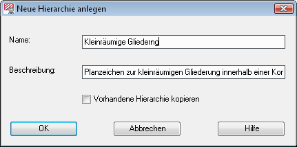 Eine eigene Hierarchie ist schnell neu erzeugt. Mithilfe des Befehls Neue Hierarchie anlegen…fordert WS LANDCAD zur Eingabe eines Namens und zu einer beliebigen Beschreibung auf.