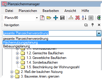 Der Name der aktiven Hierarchie wird in der obersten Zeile des Navigationsfensters angezeigt. Die Hierarchie ’gesamte Planzeichenverordnung’ spiegelt alle nach Planzv90 und weitere nach XPlanung möglichen Festsetzungen und Darstellungen wider. In ’Flächennutzungsplanung’ sind im Groben nur die nach § 5 BauGB zulässigen Darstellungen und unter ’Bebauungsplanung’ die nach § 9 BauGB zulässigen Festsetzungen einsortiert. |
