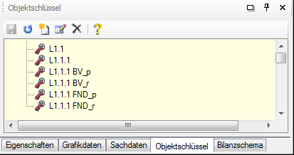 Die angelegte Objektschlüsseldatei kann im Fenster Bilanzschema betrachtet und editiert werden. Sie enthält zunächst nur alle in der Systemdatenbank vorhandenen Planzeichenschlüssel, welche mit einem roten Schlüsselicon versehen sind. Den Planzeichenschlüsseln sind noch keine Objektschlüssel zugeordnet.