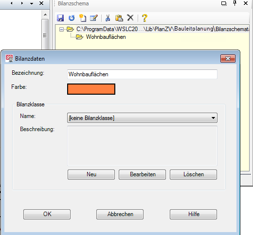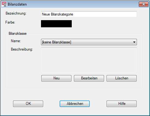 - Bilanzklasse – Der Dialogbereich Bilanzklasse dient primär zur Zuordnung einer Bilanzklasse aus dem Reservoir der Systemdatenbank. Darüber hinaus lassen sich Bilanzklassen auch editieren, vollständig neu anlegen oder löschen.