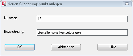 Notwendig ist eine Bezeichnung, ergänzt werden kann sie durch eine Nummer (Datentyp: alphan-umerisch). Die Ablage dieses neuen Abschnitts ergibt sich aus der zuvor markierten Position innerhalb der Navigations-leiste. Der neue Gliederungs-punkt wird als Unterordner eingerichtet. |
