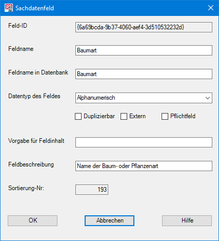 - Feldname – Unter dieser Bezeichnung erscheint das Sachdatenfeld in der Liste der verfügbaren Sachdatenfelder.