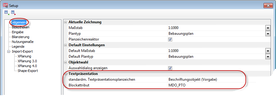Planzeichenbezogene Texte, die mit einer älteren Version als WS LANDCAD 2013 erzeugt wurden, werden in Präsentationsplanzeichen konvertiert. Planzeichenbezogenen Texte müssen mit dem früheren Befehl Textübernahme oder aber direkt über das Sachdateneingabefeld als Inhalt in die Zeichnung übergeben werden, um so mit dem entsprechenden Planzeichen verknüpft zu werden. Im PZV-Setup ist auf dem Reiter Allgemein das Textpräsentationsplanzeichen mit dem dazugehörigen Blockattribut eingetragen. Darüber wird der Text nach dem Konvertieren in der Zeichnung dargestellt und ist assoziativ zu der repräsentierenden Fläche. Wird also der Sachdatenwert eines Planzeichens editiert, dann wird der neue Wert automatisch in der Zeichnung aktualisiert. Im Planzeichenmanager ist das Textpräsentationsplanzeichen in der Planzv90 unter Allgemeine Plandaten zu finden.
