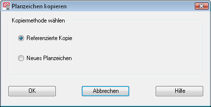 Beim Kopieren eines Planzeichens erscheint nach dem Loslassen der Maustaste der Dialog Planzeichen kopieren, in welchem Sie die Entscheidung zur Kopiermethode wie folgt treffen müssen: