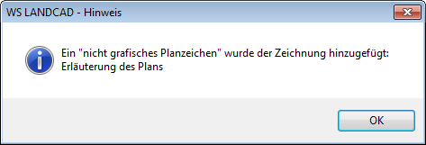 Bei der Anwendung wird kein Einfügepunkt abgefragt, da das Planzeichen im grafisch unabhängigen Dictionary der Zeichnung abgelegt wird. Stattdessen erscheint ein entsprechender Hinweis, welcher die Beschreibung des Planzeichens beinhaltet.
