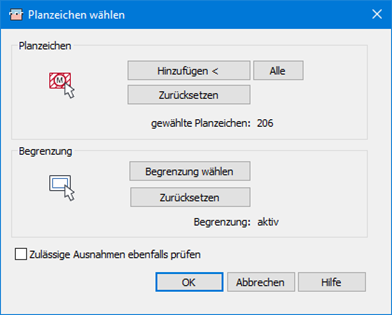 Die Plangrenze kann das Planzeichen ‘Geltungsbereich‘ oder eine beliebige geschlossene Polylinie sein (Begrenzung: aktiv), mit Hilfe der Schaltfläche Zurücksetzen kann die Wahl aufgehoben werden (Begrenzung: keine). Nach der Selektion der Planzeichen und der Wahl einer Begrenzung ist der Dialog mit OK zu bestätigen. Die hier gewählte Begrenzung dient ebenso der Begrenzungsprüfung.