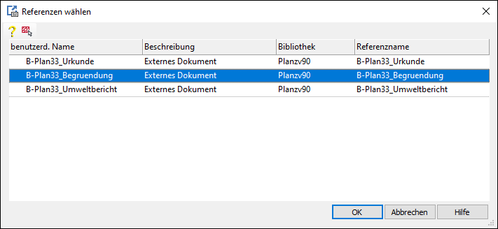 Mit Aufruf des Befehles Referenzen wählen werden die in der Zeichnung bestehenden Externen Dokumente oder zu verlinkende Planzeichen angezeigt. Durch einen Klick in eine Zeile des Dialoges kann ein Dokument oder Planzeichen gewählt werden. Über OK wird das Dokument mit der aktuellen Sachdatenzeile im Dialog "Referenzen editieren" verknüpft.