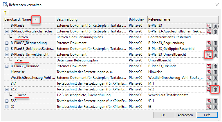 Da diese Referenz-Planzeichen keine Bilanzklassen aufweisen, können sie in der Ansicht "nach Bilanzklasse" schnell unter dem Eintrag "keine Bilanzklasse" aufgefunden und über das Kontextmenü gelöscht bzw. bearbeitet werden. |