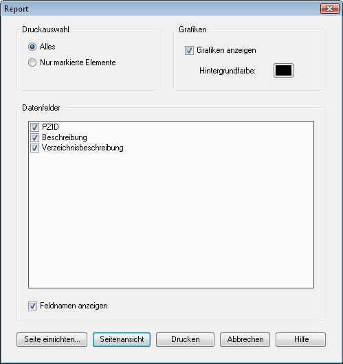 Im speziellen Fall des Planzeichenmanagers hat man durch die Report-Funktion die Möglichkeit, die Planzeichen des markierten Gliederungspunkts auf einem Drucker auszugeben. Die Datenfelder