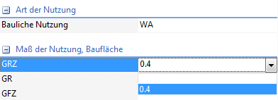Im Sachdaten-Dialog sind die einzelnen Datenfelder gruppiert. Die Gruppennamen sind blau unterlegt. Einen Wert kann man entweder manuell in ein Eingabefeld eingeben oder, falls vorbereitet, aus einer Klappliste mit Vorgabewerten auswählen. Für Beschriftungszwecke können in den Sachdatenfeldern Dezimalwerte mit Punkt oder Komma versehen werden, ebenso können Einheiten eingetippt werden. Einheiten müssen allerdings bei Exporten zu XPlanGML weggekürzt werden. Das Programm erledigt dies bei Datenfeldern vom Typ Dezimal automatisch! Bei einem Tausendertrennzeichen (z. B. GF 3.600 m²) ist ein Wegkürzen jedoch problematisch. Um also zu vermeiden, dass derartige Zahlen als Dezimalwerte mit drei Nachkommastellen in Datenexporte eingehen, sollten Eingaben mit Tausendertrennzeichen vermieden werden!