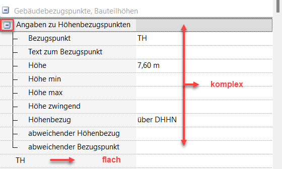 Im XPlan-Kontext können sogenannte komplexe Datentypen vorkommen. Im Gegensatz zu flachen Sachdatenfeldern (z. B. GF oder TH) weisen komplexe Sachdatenfelder Unterattribute auf. Im Sachdaten-Dialog stellen sich komplexe Sachdatenfelder exemplarisch wie folgt dar: