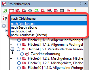 Projektbrowser Steuerung der Ansicht Für eine bessere Übersicht der angewendeten Planzeichen arbeitet der Projektbrowser mit verschiedenen Ansichten. Hierbei kann zwischen nach Objektname, nach Beschreibung, nach Bibliothek und nach Bilanzklasse gewählt werden.