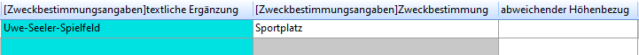 Die Reihenfolge der Datenspalten ist beim Öffnen des Dialoges von links nach rechts alphabetisch sortiert. An den Anfang der Sortierung werden von links gesehen jedoch die Namen komplexer Sachdatenfelder angezeigt. Wenn also im Komplex Zweckbestimmungsangaben das Unterattribut Zweckbestimmung befüllt ist, taucht es aufgrund der eckigen Klammern in der Spaltenanordnung vor einem flachen Attribut beginnend mit dem Buchstaben A auf.