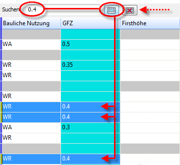 In der Menüzeile des Dialoges befindet sich ein Suchfeld. In dieser Suchzeile kann ein Wert eingegeben werden, nach dem in der aktiven Datenspalte gesucht werden kann. Die Datenzeilen mit entsprechenden Treffern werden vom Programm gewählt, was durch eine dunkelblaue Markierung angezeigt wird. Das Suchen wird durch den Befehl Zeilen suchen und auswählen gestartet. Ein mehrfaches Anklicken der Funktion sucht nach weiteren Treffern in der Datenspalte. Um die Auswahl aufzuheben und den im Suchfeld eingetragenen Wert zu löschen, ist der Befehl Auswahl zurücksetzen zu nutzen.