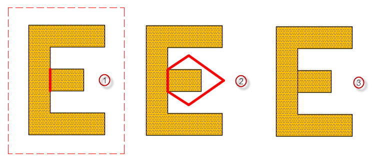 Bei der Volumenkörperbildung aus der Schnittlinie wird intern um die gesamte zu teilende Fläche ein Rechteck gezogen. Auf dem Weg zu diesem virtuellen Rechteck ((1) - rote, gestrichelte Linie) tangiert die rote Schnittlinie das zu schneidende Polygon mehrfach, was letztlich zu keinem zufriedenstellenden Ergebnis führen kann. Um derartige Schwierigkeiten zu vermeiden, sollte man in diesen Fällen die Schnittlinie geschlossen zeichnen (2) und dabei den abzutrennenden Teil komplett in die „Schnittfläche“ einbeziehen. Mit dieser Lösung kommt man in jedem Fall zum Ziel (3).