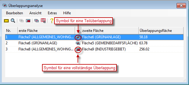 Der Befehl Auf Überlappung prüfen führt eine Überprüfung auf überlappende Flächen sowie doppelte Linien und Symbole durch. Gibt es Flächen, bei denen eine Überlappung vorliegt, so werden diese in der Überlappungsanalyse aufgeführt. Es wird aufgelistet, welche Flächen sich überlappen (erste Fläche; zweite Fläche), genauso wie die Größe der Überlappungsfläche.
