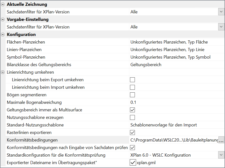 - Vorgabe-Einstellung - Sachdatenfilter für XPlan-Version - Für eine Zeichnung ohne Planzeichen greift das Programm beim Anwenden des ersten Planzeichens auf die unter Sachdatenfilter für XPlan-Version gewählte Version zurück und setzt die entsprechenden Parameter für die Option Aktuelle Zeichnung - Sachdatenfilter für XPlan-Version. Alle zeigt ungefiltert alle dem Programm bekannten Sachdatenfelder an. XPlan 6.0 - WSLC Konfiguration heißt wiederum, dass nur Sachdatenfelder im Sachdatendialog sichtbar sind, die auch zur Version 6.0 exportiert werden können!