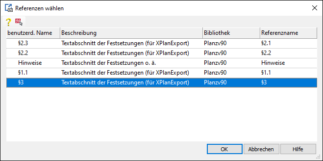 Die bereits erzeugten Textabschnitte sind häufig für mehrere Nutzungsflächen wirksam. Es ist daher problemlos möglich, aus einer übersichtlichen Auflistung bestehende Textbausteine auszuwählen und mehreren, anderen Flächen zuzuweisen. Hierzu ist ebenfalls der Befehl Referenzen... über die Multifunktionsleiste aufzurufen. Im Dialog "Referenzen editieren" betätigt man dann die Schaltfläche für Referenzen wählen