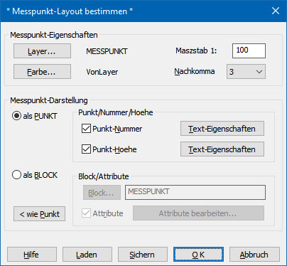 Für den Messpunkt (als Punkt oder Blockeinfügung) sind Layer und Farbe einstellbar. Wichtig ist ebenso, dass Sie den richtigen Maßstab für die Messpunkte angeben - dies ist der Maßstab, mit welchem Ihre Zeichnung später geplottet werden soll. Anhand des Maßstabes ist es möglich, sowohl für die Texte (Punktnummer/Punkthöhe) wie auch für die Attribute die Größe/Höhe und auch die Text/Attributposition mit den Werten auf Plot (in Einheiten) anzugeben.