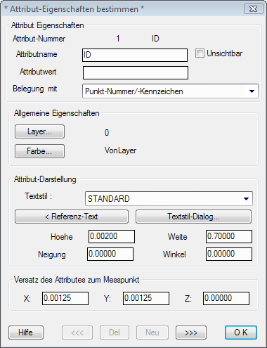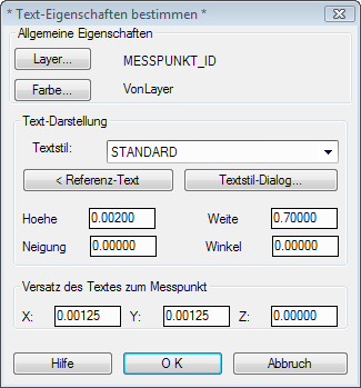 Werden Texte bzw. Attribute verwendet, so kann deren Aussehen ebenfalls vollständig gesteuert werden, alle Eigenschaften (Schrift-Stil, -Höhe, -Winkel, -Neigung, Layer, Farbe etc.) sind frei und für jeden Text bzw. jedes Attribut getrennt einstellbar! Bei Attributen kann zusätzlich angegeben werden, ob es unsichtbar/sichtbar generiert werden soll, welchen Namen das Attribut selbst trägt und welchen Datenwert eines Messpunktes ein Attribut als Inhalt erhalten soll.