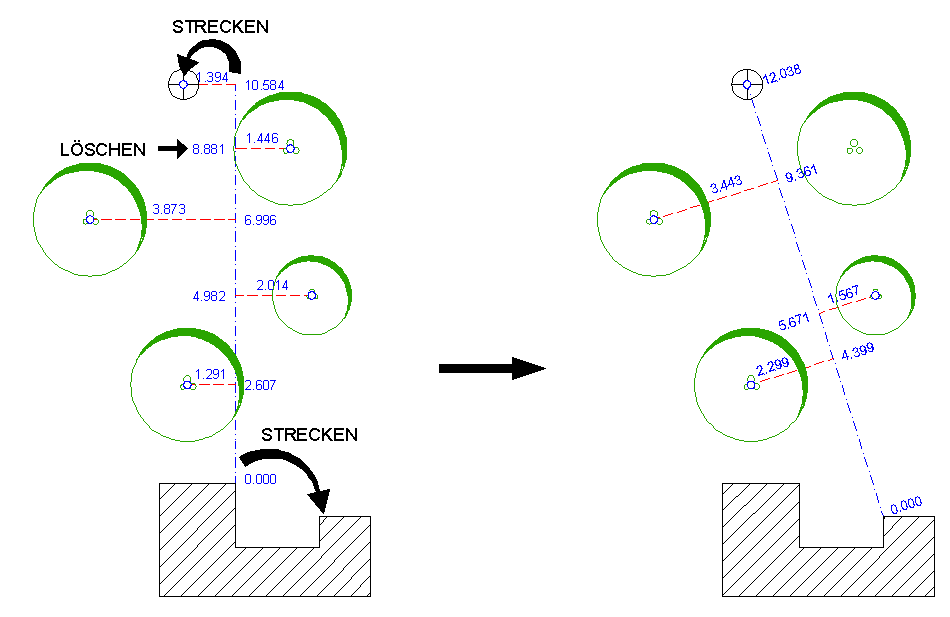 Zur assoziativen Positionsänderung kommen die CAD-Editierbefehle SCHIEBEN und STRECKEN nahezu identisch zum Einsatz.