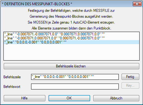 Im Messpunktblock-Modus Durch Messfile erzeugter Block bietet Messfile Ihnen die Möglichkeit die Zeichnungselemente (Punkte, Linien, Kreise...), welche den benannten Block zusammen mit den Attributen bilden, unmittelbar in Messfile selbst zu bestimmen. Dazu nutzen Sie die Schaltfläche ELEMENTE BESTIMMEN, worauf sich eine Dialogbox öffnet, in welcher Sie die Befehlszeilen zur Blockelement-Erzeugung definieren können. Die Methode besteht darin, dass Sie mit jeder Befehlszeile ein CAD-Element erzeugen; dabei geben Sie in einer Befehlszeile einfach alle CAD-Befehle genauso ein, wie Sie es manuell im Zeichnungs-Editor tun würden, um solch ein Elemente zu erzeugen. |