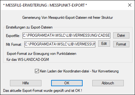 Im Eingabefeld EXPORTFILE geben Sie bitte den Namen der zu exportierenden Datei an. Sie können alternativ dazu auch die Schaltfläche DATEI nutzen, um den Standard-Auswahldialog aufzurufen. Durch Betätigung der Schaltfläche FORMAT können Sie die entsprechende Punkt-Export-Definitionsdatei wählen.