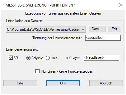 Nach der Auswahl dieser Messfile-Erweiterung wird die Schaltfläche GENERIERUNG freigegeben, welche den entsprechenden Dialog öffnet. In der Dialogbox können Sie für die Linienzüge einen eigenen Layer angeben und die Art der zu erzeugenden Linienzüge beeinflussen (2D/3D-Linien, Polylinien). Wenn Sie eine Liniendatei mit der Schaltfläche DATEI ausgewählt haben, wird diese der Liste bereits ausgewählter Liniendateien zugefügt; die in der Popup-Liste markierte Liniendatei steht dann mittels der Schaltfläche EDIT für Einsicht u. Bearbeitung zur Verfügung. Bei der Beendigung des P-LINIEN-Dialoges mit OK werden alle Liniendateien durch P-LINIEN geladen und analysiert sowie eine entsprechende Meldung ausgegeben. Diese beinhaltet entweder die Anzahl der Linien und Punkte in den Liniendateien oder die Art der ggf. gefundenen Fehler. Im Fehlerfalle können Sie den P-LINIEN-Dialog durch Betätigung der Schaltfläche ABBRUCH beenden. P-LINIEN bietet durch Aktivierung des entsprechenden Kontrollfeldes zusätzlich die Möglichkeit, nur die Linien zu erzeugen. Die Grafikgenerierung der Messpunkte wird dabei unterdrückt und durch eine entsprechende Meldung angezeigt.