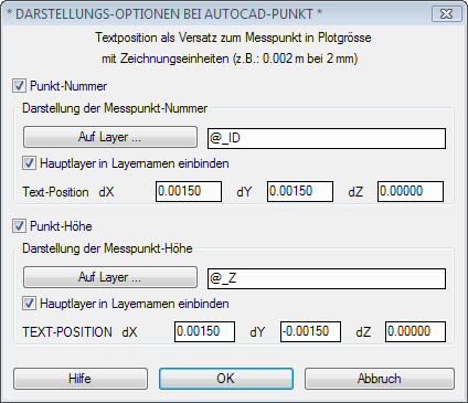 Die einfachste Form der Messpunkt-Darstellung erfolgt mit einem CAD-Punkt, wobei diesem CAD-Punkt optional zusätzlich die Texte für die Punktnummer und/oder die Punkthöhe an beliebiger Position beigestellt werden kann. Sie können diese Punkte später mit Hilfe des CAD-Befehls DDPTYPE in ihrem Aussehen beeinflussen. Die Gestaltung der Punktnummern-, Punkthöhen-Texte können Sie mit Hilfe der Dialogbox MESSPUNKT EIGENSCHAFTEN einstellen. Beachten Sie bitte, dass der Versatz für Textpositionen in Zeichnungseinheiten [i.A. "m"], aber in Plotgröße angeben wird, da Messfile den Versatz letztendlich mittels des Maßstabes selbst berechnet. Soll also die Punktnummer -1.5 mm auf dem Plot in Y-Richtung verschoben sein und Ihre Zeichnungseinheit ist m, so tragen Sie bitte -0.0015 im Editierfeld ein.