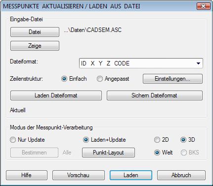 - Laden der Messpunkte aus der Datei, wobei jene ggf. bereits in der Zeichnung bestehenden Messpunkte automatisch aktualisiert werden.