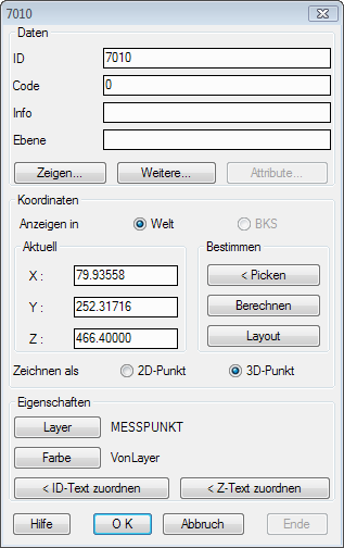 Wenn Sie die Messpunkt-Koordinaten ändern wollen, können Sie die neuen Koordinaten als WKS-Koordinaten oder als BKS-Koordinaten eingeben - intern werden stets nur die Welt-Koordinaten mitgeführt und bei Bedarf auf das aktuelle BKS umgerechnet. Mit der Berechnen-Funktion stehen Ihnen alle gängigen Methoden bereit, um die Koordinaten eines Messpunktes berechnen zu lassen. Wenn Sie die neue Position bereits kennen, können Sie diese auch mit <Picken in der Zeichnung zeigen. Weiterhin wird angezeigt, ob der Messpunkt in der Zeichnung als 2D-Punkt (auf Zeichnungshöhe 0.0) oder als 3D-Punkt mit seinem echten Höhenwert besteht - natürlich kann auch diese Einstellung verändert werden. Um das Layout eines angezeigten Messpunktes zu ändern, nutzen Sie bitte den Layout-Button; es wird stets das aktuelle Layout des Messpunktes angezeigt! Ist der Messpunkt als Punkt mit Texten definiert, können bei Bedarf Punktnummern- und Punkthöhen-Text mit ID-/Z-Text zuordnen neu zugeordnet werden (falls die Kopplung Punkt-Text verloren gegangen ist). Natürlich sind auch die Element-Eigenschaften Layer und Farbe frei einstellbar. |